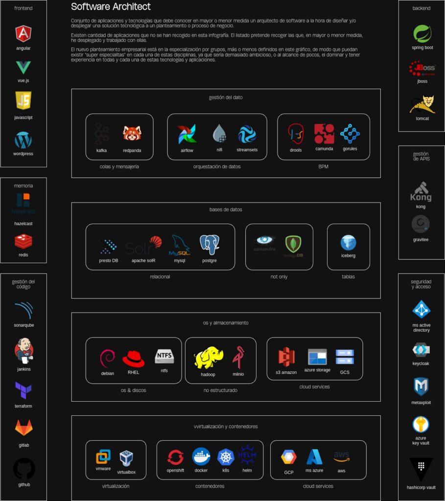 Applications, technologies, and services in a single image, at a glance. This way, and grouped together, you can see these applications, technologies, and services based on their nature or use. While incomplete, as it would be a very dense work, they are intended to serve as a starting point for deploying applications and services reliably in any public cloud or on-premises.